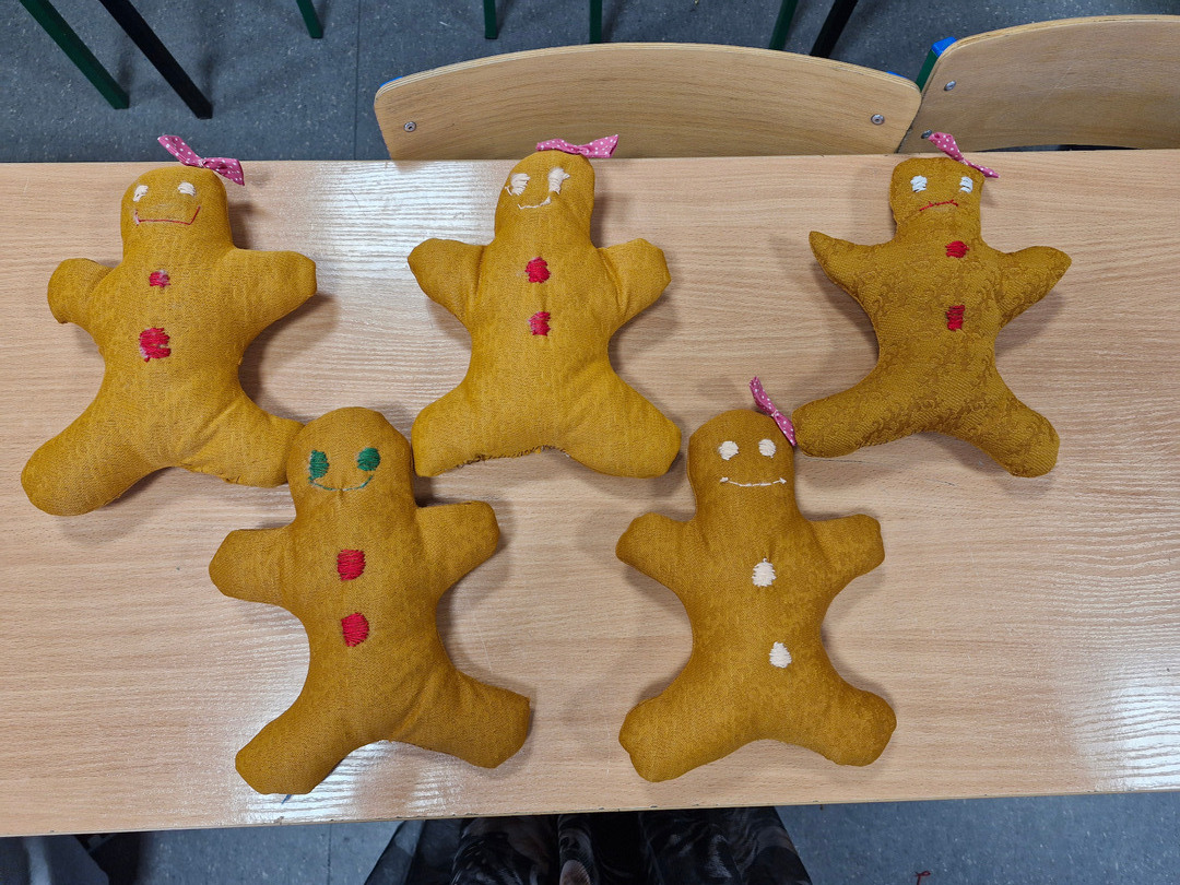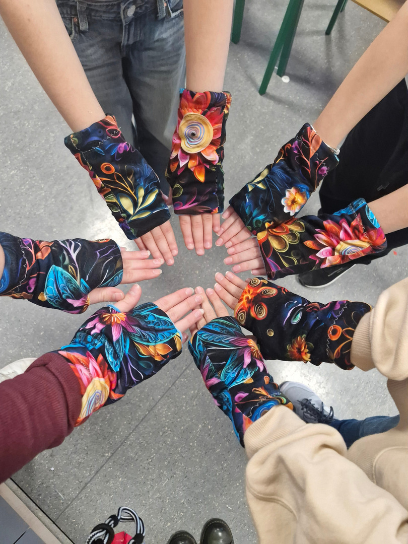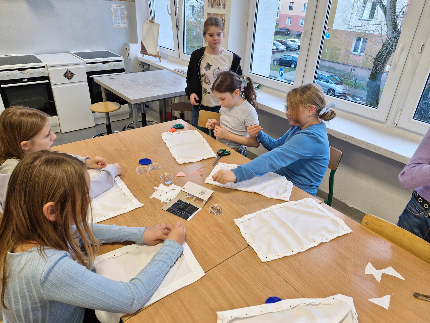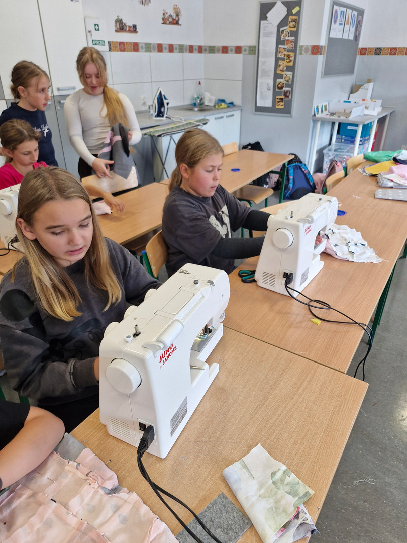 Uczennice klas piątych uczestniczące w zajęciach krawieckich w ramach Programu Kompetencji Kluczowych zapoznały się z podstawami szycia na maszynie. W trakcie zajęć zdobywały praktyczne umiejętności, realizując kolejne projekty krawieckie. Swoją przygodę z szyciem rozpoczęły od wykonania toreb na ramię, następnie uszyły kosmetyczkę, opaski na głowę, rękawiczki bez palców oraz poszewkę, serwetkę pod talerz i małą maskotkę - piernika. Ostatnim, bardziej zaawansowanym wyrobem jest bluzka, nad którą uczennice nadal pracują. Zajęcia pozwoliły im rozwijać kreatywność, cierpliwość oraz zdolności manualne, a także dały dużo satysfakcji z samodzielnie wykonanych prac.