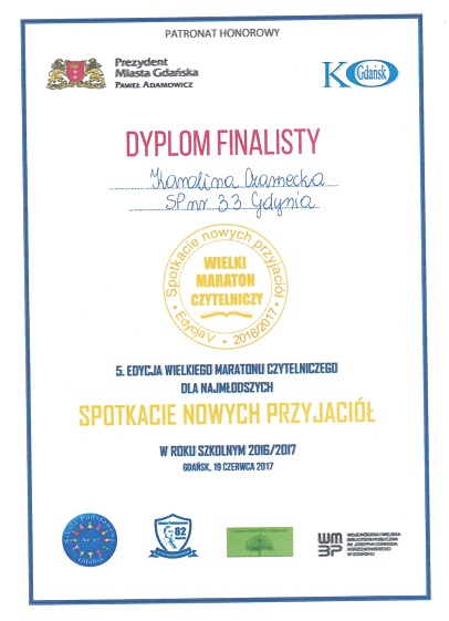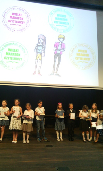 Po raz kolejny dzieci z naszej szkoły brały udział w Wielkim Maratonie Czytelniczym. W roku szkolnym 2016/2017 do konkursu przystąpiło ponad 3,5 tysiąca dzieci z klas I-III ze 132 szkół z województwa pomorskiego. Przyznano 75 tytułów laureata, 120 finalisty oraz 160 wyróżnień. Tym bardziej cieszy fakt, iż w gronie nagrodzonych znaleźli się uczniowie z naszej szkoły. Lureatką konkursu została Maja Walczak z III C, finalistką Karolina Czarnecka z klasy III A, wyróżnienia otrzymały Wiktoria Grudka oraz Małgorzata Zawierska z III C.