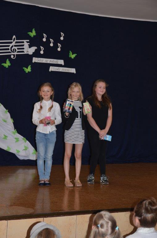 29 maja Świetlica Szkoły Podstawowej nr 6 w Gdyni zorganizowała konkurs piosenki z lat 60 - tych i 70 - tych. Trzech uczniów naszej szkoły wraz z opiekunami udali się by spróbować swoich sił na scenie przed publicznością, byli to : Nikodem Knapik klasa Ia z utworem "Historia pewnej znajomości", Zuzanna Pietrzyk IIb " Chłopiec z gitarą" oraz Katarzyna Laskowska klasa IIIc "O mnie się nie martw". Konkurencja była duża a konkurs odbywał się w kilku kategoriach. Przedstawiciele szkół sami głosowali na najładniej wykonany utwór dziecięcy. Doskonale przygotowani reprezentanci naszej szkoły odśpiewali swoje utwory a Zuzanna Pietrzyk zajęła II miejsce w kategorii klas II i III. Serdecznie gratulujemy !