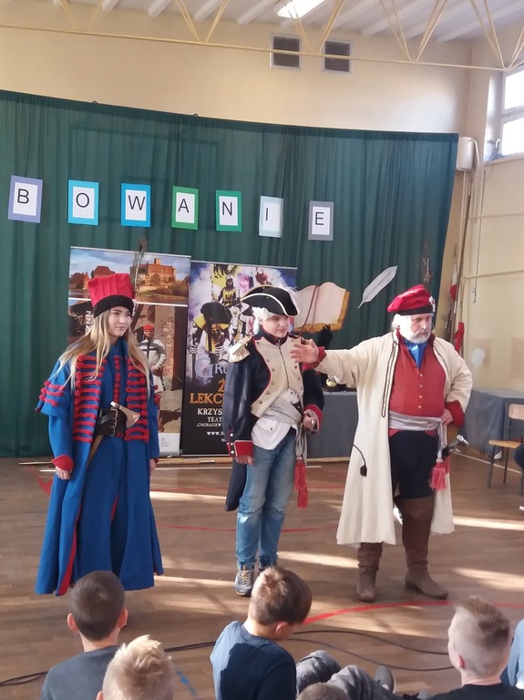 Ku Niepodległej – lekcja bardzo aktualna w przededniu setnej rocznicy odzyskania przez Polskę niepodległości. Przypomniano młodzieży tematykę powstań listopadowego i styczniowego, zwrócono uwagę na rolę kosynierów i wojska Księstwa Warszawskiego. W tej niezwykłej wędrówce przez lata zaborów towarzyszyli naszym uczniom Tadeusz Kościuszko, Napoleon Bonaparte, Józef Wybicki, Piotr Wysocki i Marszałek Józef Piłsudski.
