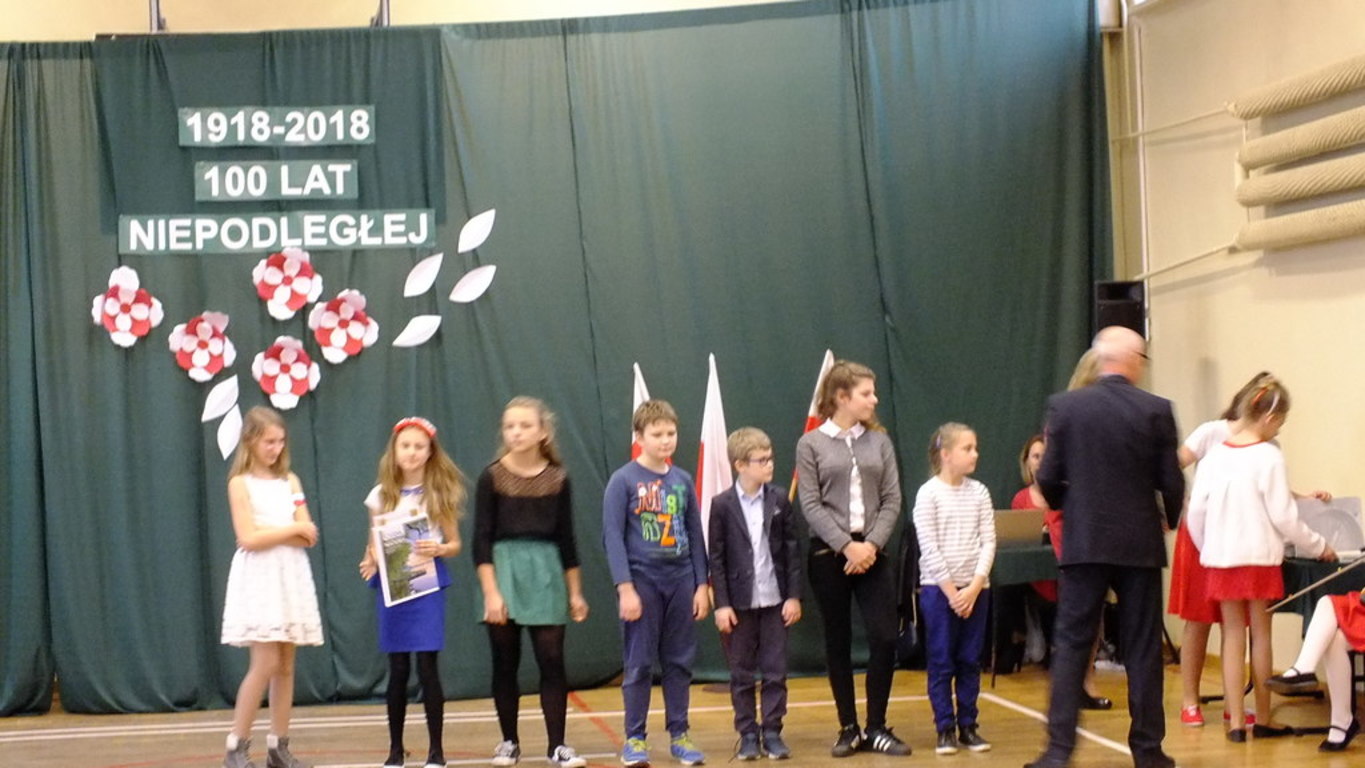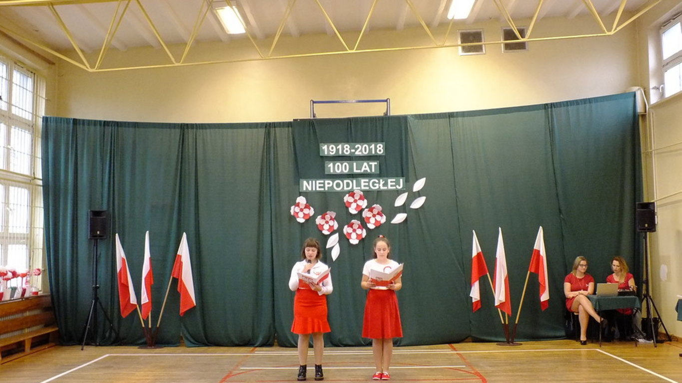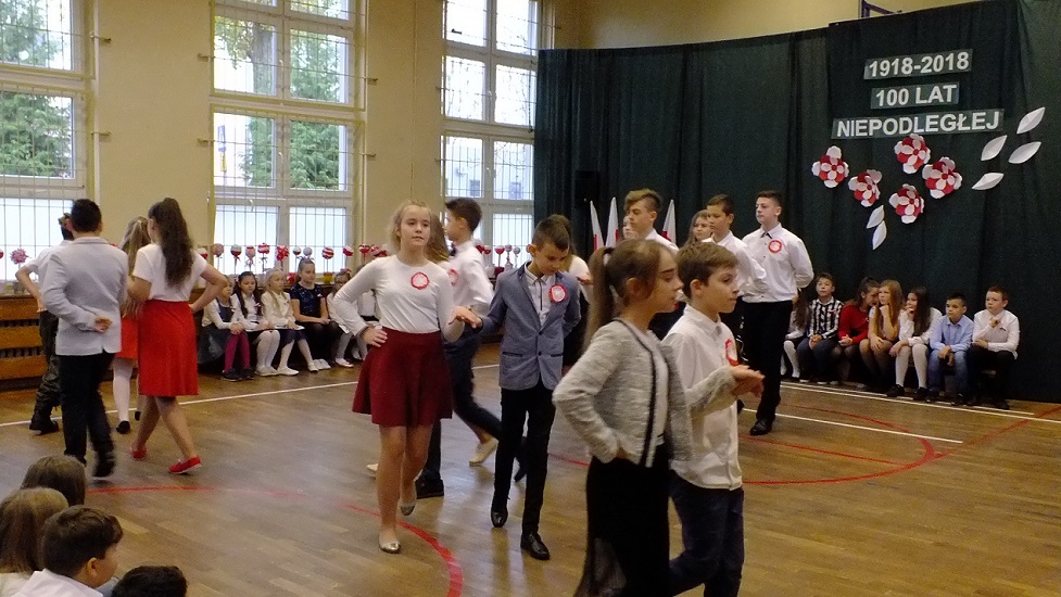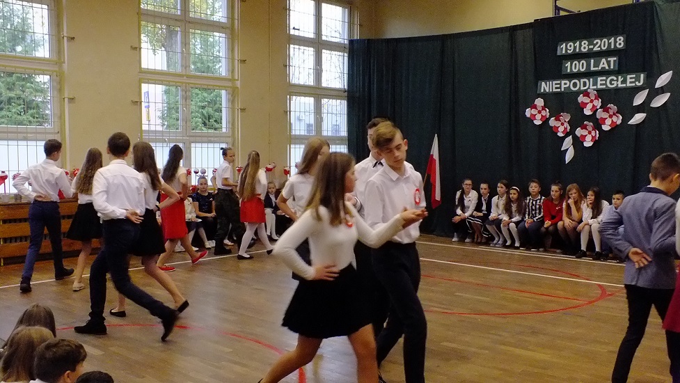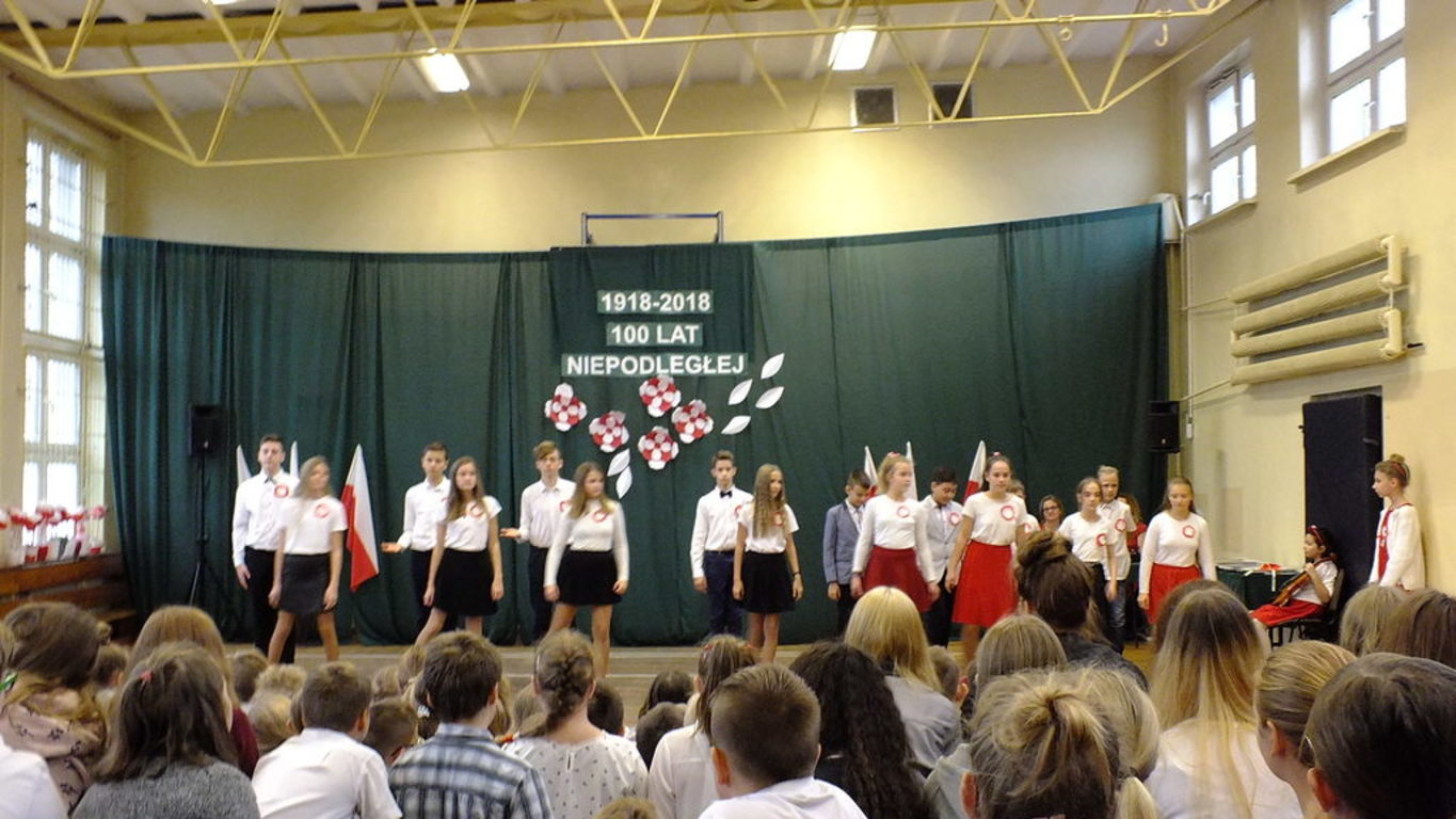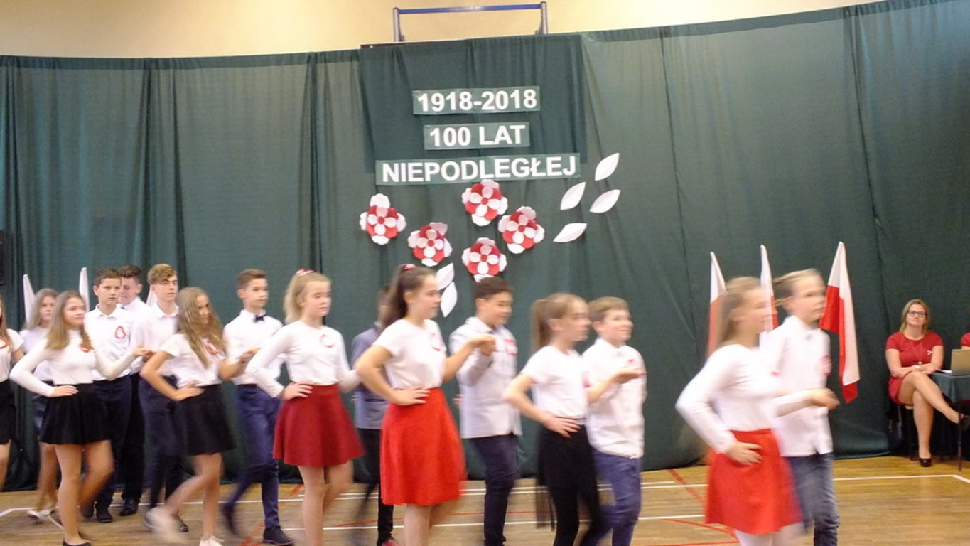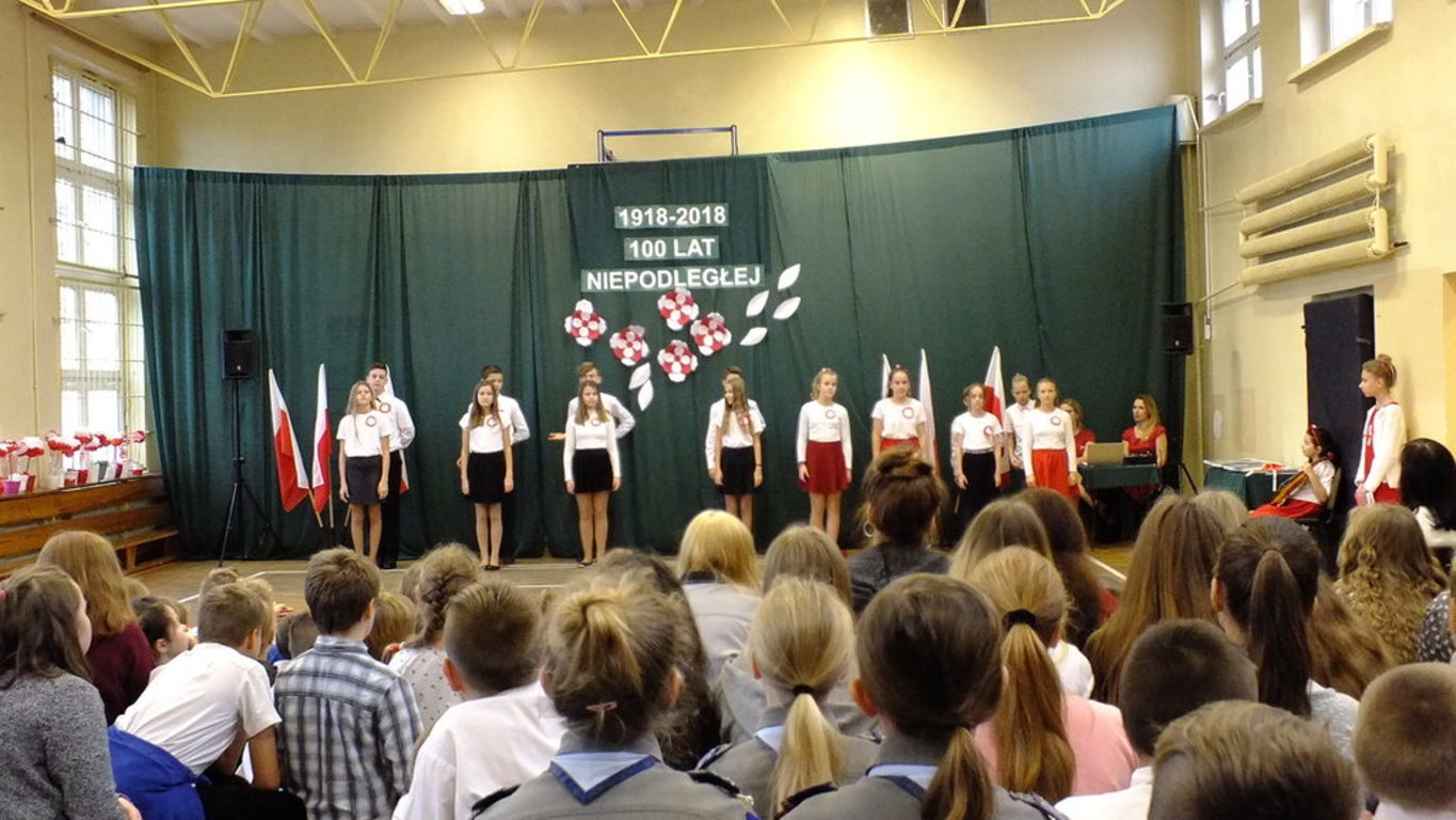 9 listopada b.r. w naszej szkole obchodziliśmy setną rocznicę niepodległości Polski. Przygotowania do tego dnia trwały od początku 2018 r., kiedy to opracowany został projekt „Dla Niepodległej”, który był wdrażany od kwietnia do listopada bieżącego roku. Zadania wyznaczone projektem zostały zrealizowane oraz podsumowane w tym bardzo uroczystym dniu, gdzie słowem, pieśnią, muzyką i tańcem świętowaliśmy rocznicę niepodległości. Polonez w formie tańca i polonez odegrany na skrzypcach wprowadziły słuchaczy w radosny i niezwykły nastrój. Kolory białe i czerwone wyraźnie odnosiły się do barw narodowych. Wstęgi narodowe przypięte do strojów wykonawców i słuchaczy wskazywały na niezwykłość wydarzenia. Mieliśmy okazję obejrzeć przedstawienie „Ta, co nie zginęła”, wysłuchać pieśni patriotycznych oraz prac literackich: Kartka z pamiętnika mojego pradziadka. Ponadto wzięliśmy udział we wspólnym śpiewaniu czterech strof „Hymnu Polski”, który o godzinie 11.11 zabrzmiał w szkołach całej Polski. Rozstrzygnięcie konkursów plastycznych, historycznych oraz literackich stanowiło ważny punkt programu „Dla Niepodległej”. Pochwaliliśmy się również wycieczkami historyczno – przyrodniczymi, które odbyły się w październiku 2018 r. do różnych miejsc naszego regionu związanych z wydarzeniami, jakich doświadczyli Polacy w swojej historii nowożytnej. Na koniec uroczystości wyruszyliśmy ścieżkami naszej dzielnicy na Paradę Niepodległości.