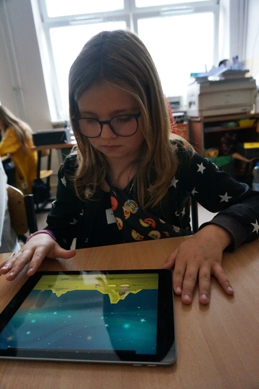 Dzisiejsze warsztaty rozpoczęły się od grupowej współpracy przy układaniu kolorowych kwadratów wg podanej instrukcji. Następnie uczniowie zostali podzieleni na dwie drużyny, a wybrani przedstawiciele każdej z nich pokonywali planszę złożoną z 16 kwadratów. Zadaniem wskazanych uczniów było przejście trasy według usłyszanych komend. Początkowo były one wydawane w języku polskim, później już w j. angielskim. Każda z drużyn zdobyła skrzyneczkę ze słodkim co nieco. Potem uczniowie pracowali z iPadami, korzystając z aplikacji Tynker oraz Hello, Byte. Zadania, jakie wykonywały dzieci, uczyły krytycznego i logicznego myślenia oraz rozwiązywania problemów. Ta część warsztatów wzbudziła najwięcej emocji i radości.