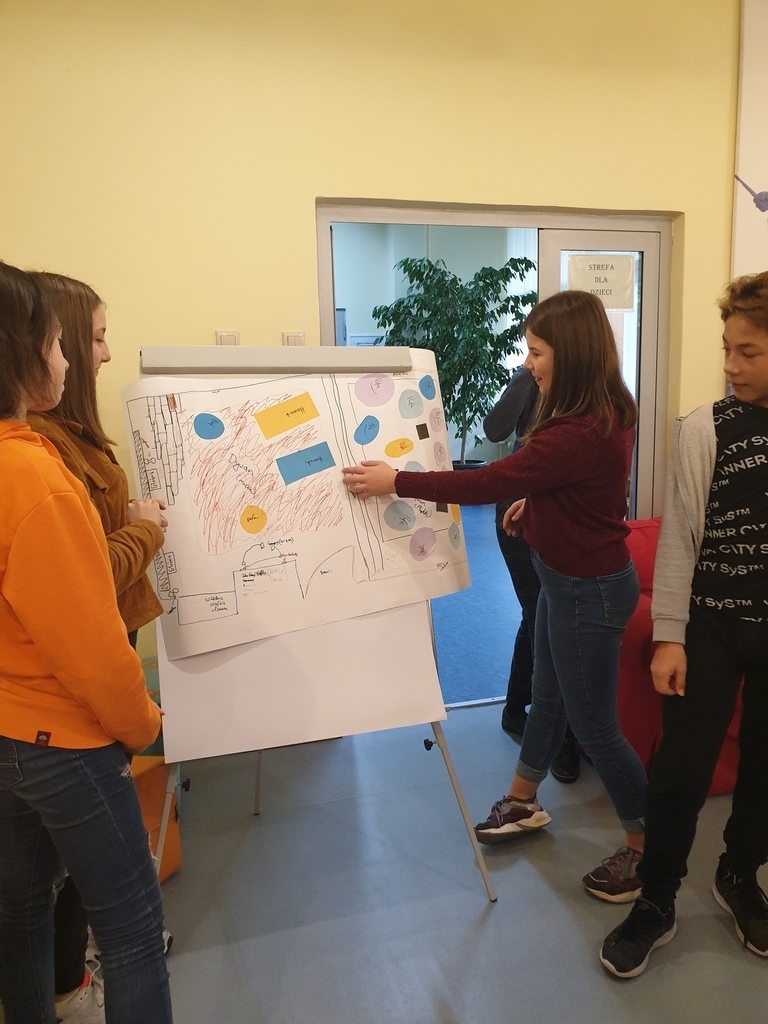 Projekt nowej przestrzeni powstał w trakcie trzech warsztatów w dniach 8-10 października. Uczniowie przeszli przez kolejne etapy projektowania metodą Design Thinking: empatię, ideację, prototypowanie i testy.