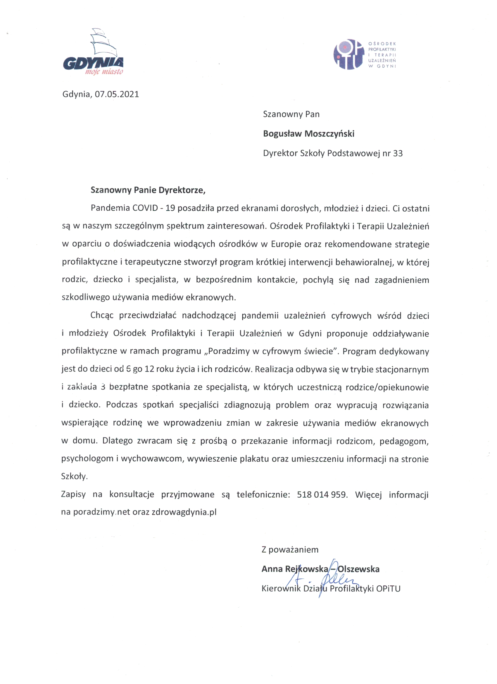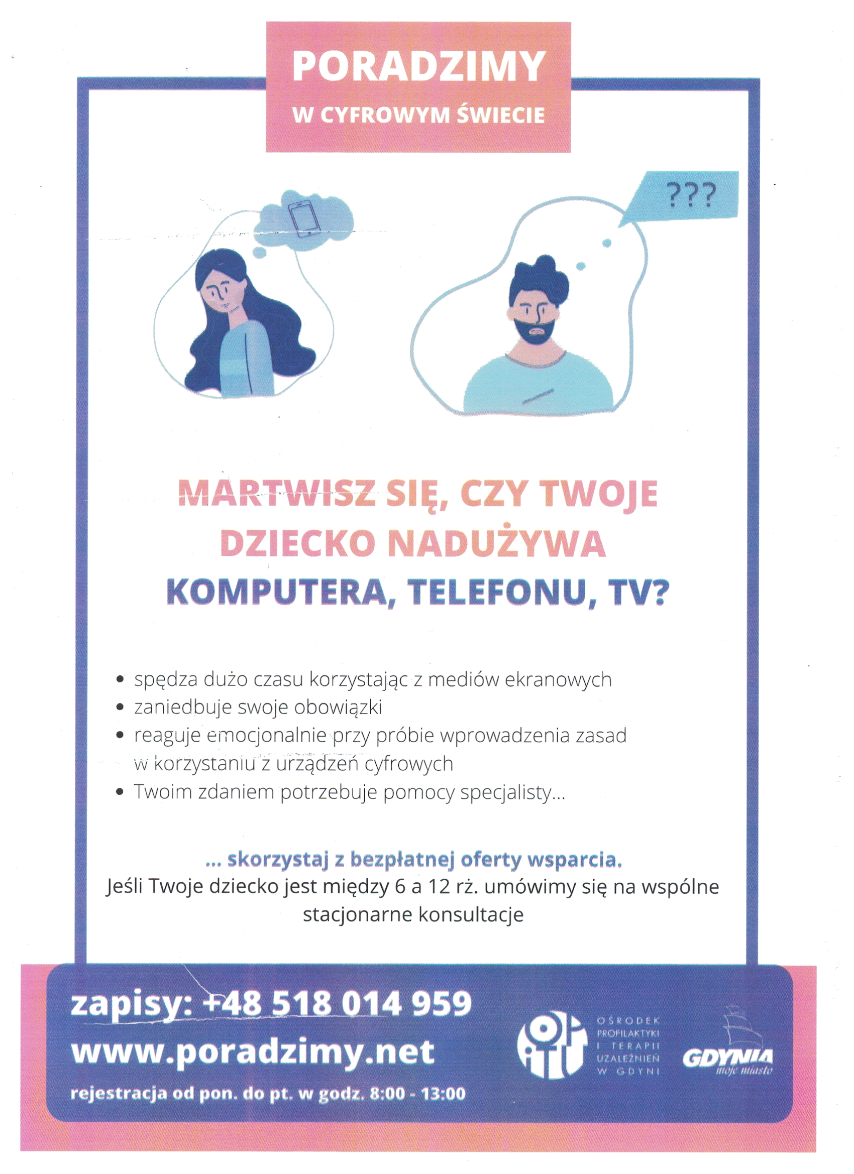 Ośrodek Profilaktyki i Terapii Uzależnień w Gdyni proponuje skorzystanie z programu "Poradzimy w cyfrowym świecie". Program dedykowany jest dzieciom między 6 a 12 rokiem życia i ich rodzicom. Zakłada trzy bezpłatne spotkania ze specjalistą dla użytkowników mających trudności z cyfrowym światem.