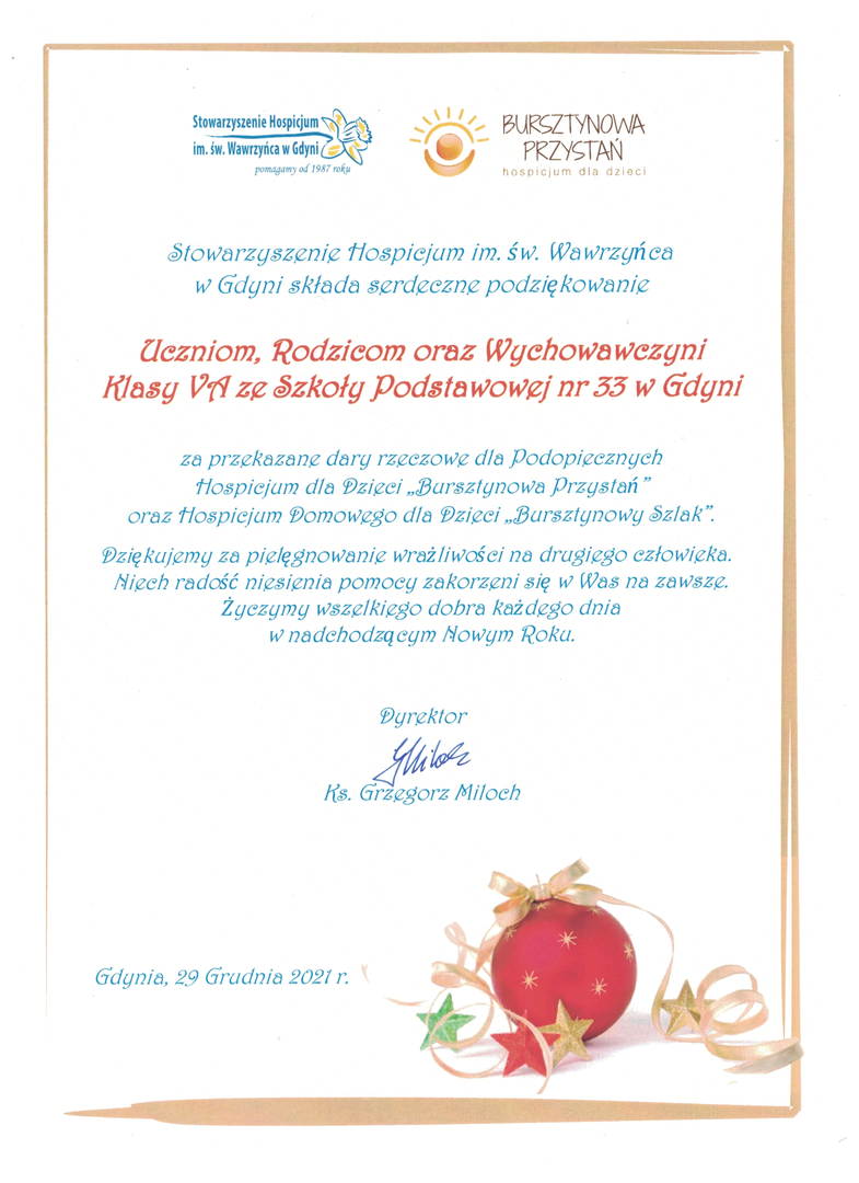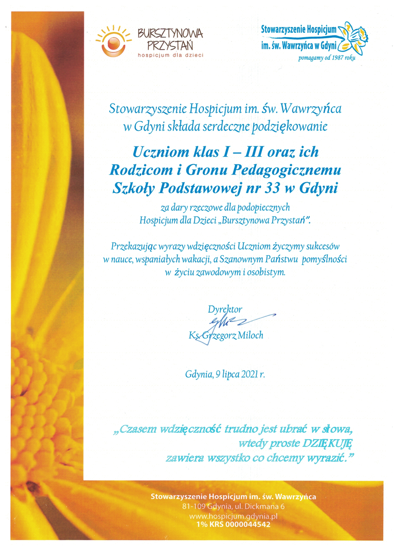 Stowarzyszenie Hospicjum im. św. Wawrzyńca w Gdyni składa serdeczne podziękowania Uczniom, Rodzicom, Gronu Pedagogicznemu - całej społeczności naszej szkoły, za przekazane dary rzeczowe oraz pielęgnowanie wrazliwości na drugiego człowieka i niesienie bezinteresownej pomocy.