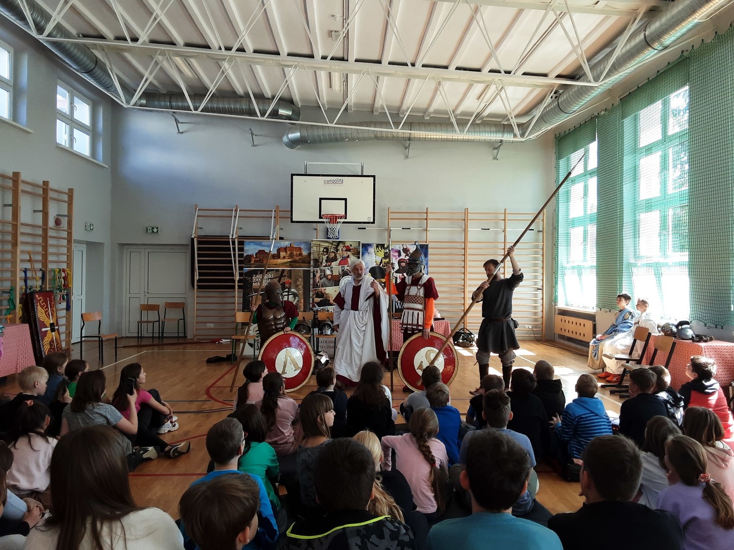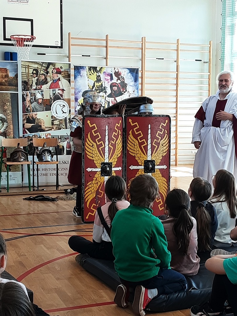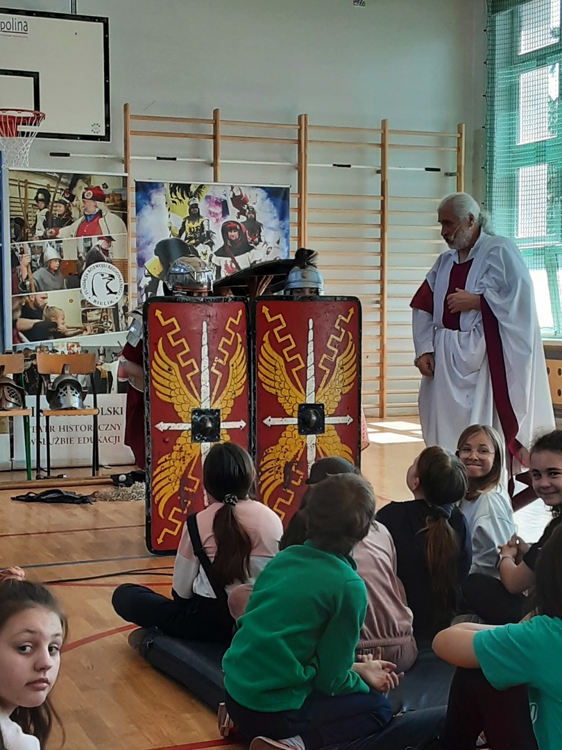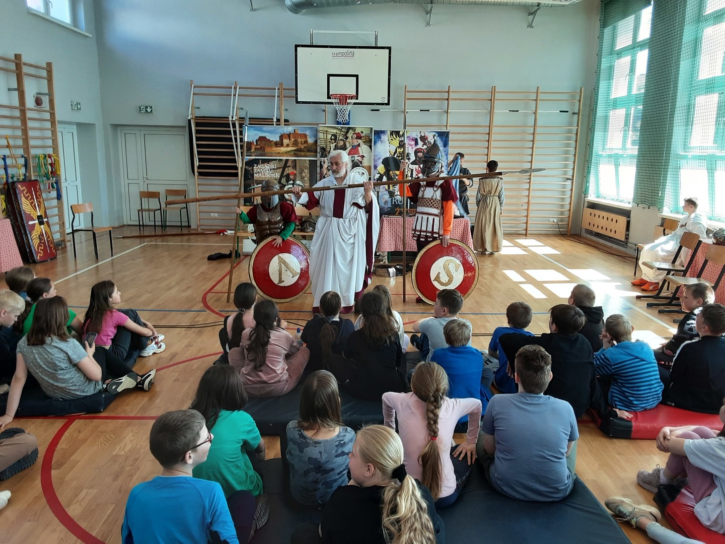 Po krótkim wstępie, po którym uczniowie klas czwartych i piątych dowiedzieli się, kiedy rozpoczęła się starożytność, przenieśli się do Antycznej Europy, aby zapoznać się kulturą Grecji i Rzymu. Zobaczyli jak ubierali się Grecy oraz Rzymianie. Uczniowie mogli wejść w skórę hoplity greckiego oraz legionisty rzymskiego. Poznali sposób walki falangi greckiej, fenomen Aleksandra Wielkiego oraz taktykę walki legionów rzymskich. Lekcja zakończyła się spotkaniem z Gladiatorami.