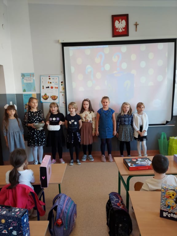 Dziewczęta z klas młodszych przygotowały dla swoich kolegów muzyczne życzenia oraz wręczyły im samodzielnie zrobione krawaty.