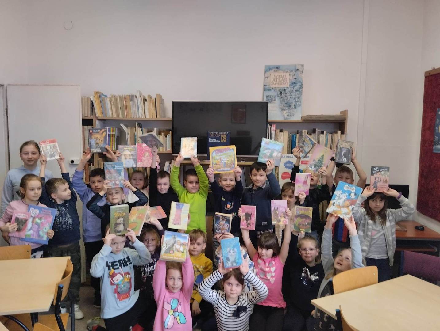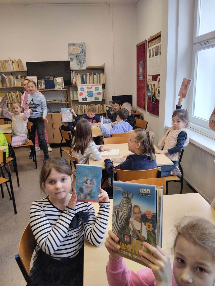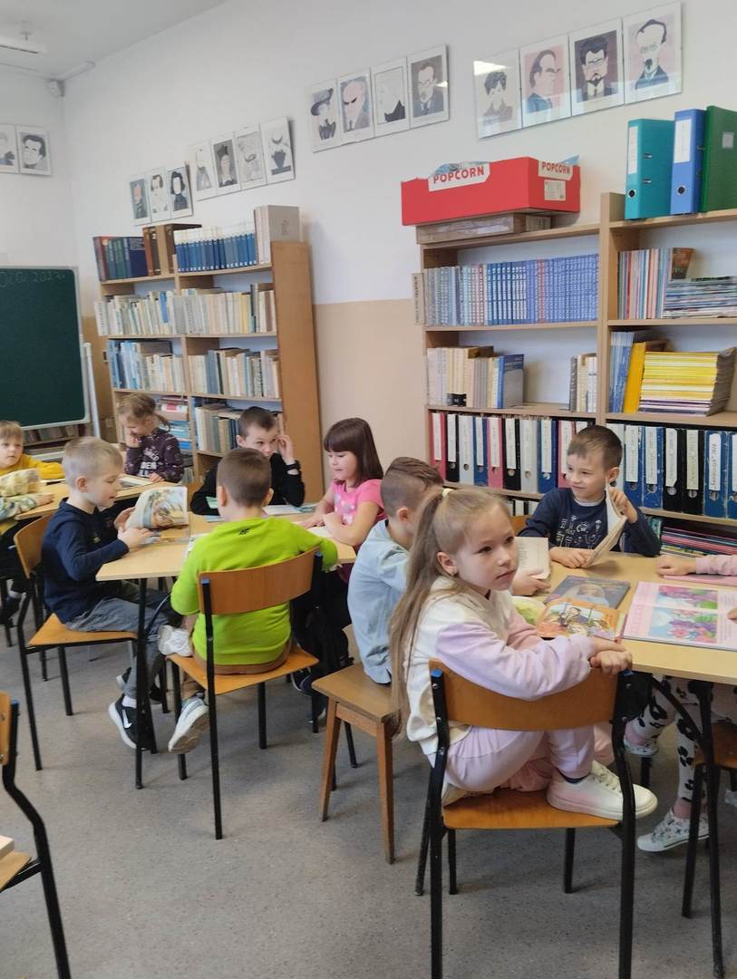 Po feriach uczniowie trzech klas pierwszych zostali czytelnikami biblioteki szkolnej . Podczas lekcji bibliotecznej na której poznali wędrówkę książki od momentu jej napisania do wydania i wypożyczenia w bibliotece. Zapoznali się z regulaminem szkolnej wypożyczalni, księgozbiorem dla dzieci, zasadami obowiązujacymi czytelnika. Wreszcie mogli wypożyczyć książkę, która im się podobała.