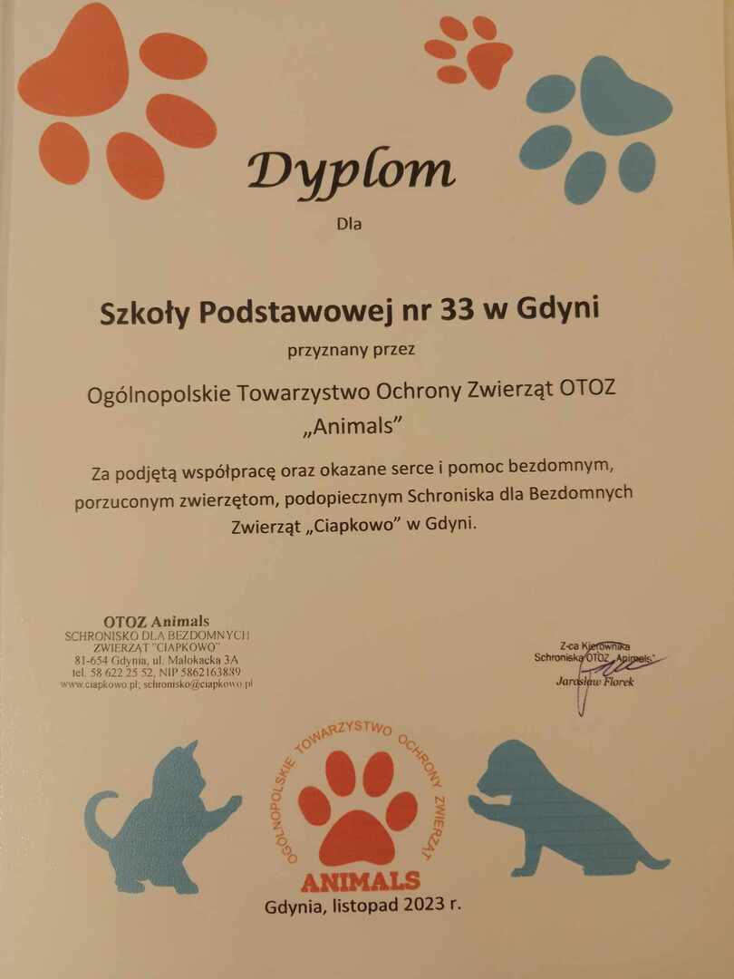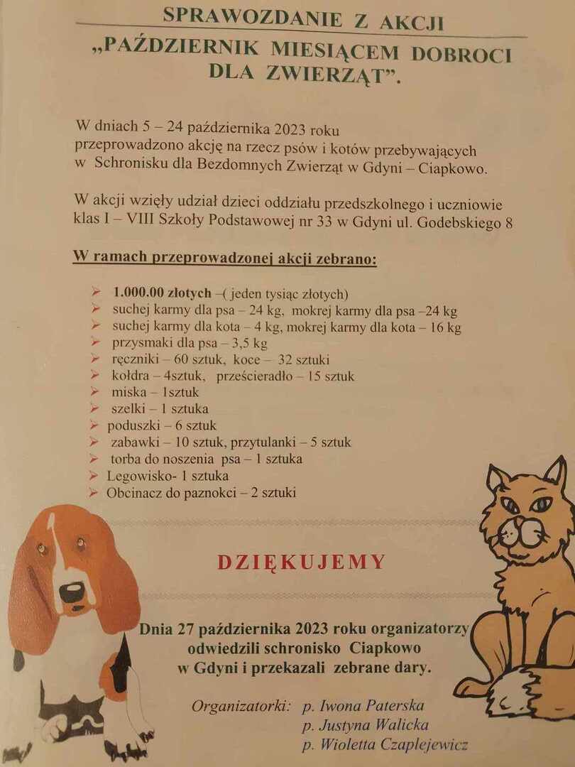 Pragniemy po raz kolejny podziękować wszystkim za niesamowite zaangażowanie podczas zbiórki na rzecz psów i kotów przebywających w Schronisku dla Bezdomnych Zwierząt „Ciapkowo” w Gdyni, która odbywała się w naszej szkole w dniach 5- 24 października. W ramach przeprowadzonej akcji zebrano 1000 złotych, 50 kg karmy dla psów, 20 kg karmy dla kotów, a także mnóstwo ręczników, koców, legowisk, poduszek i innych akcesoriów dla zwierząt. Dnia 27 października organizatorzy wraz z uczniami klasy 7C, którzy byli odpowiedzialni za zbiórkę, odwiedzili schronisko i przekazali dary.