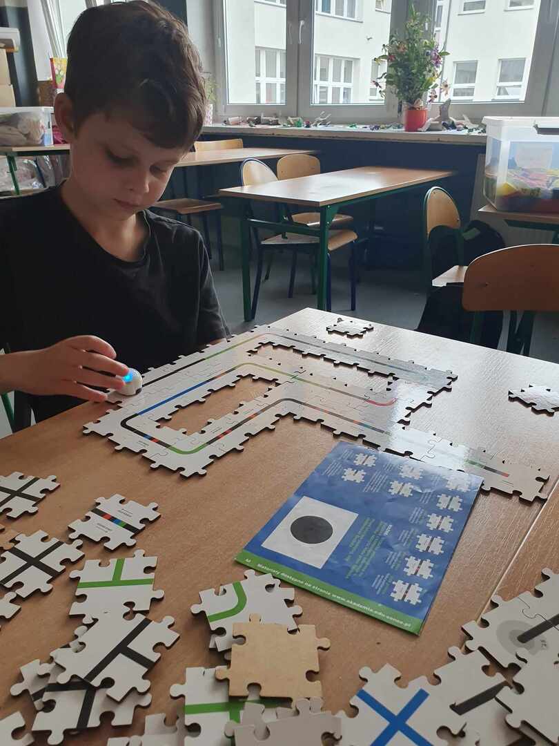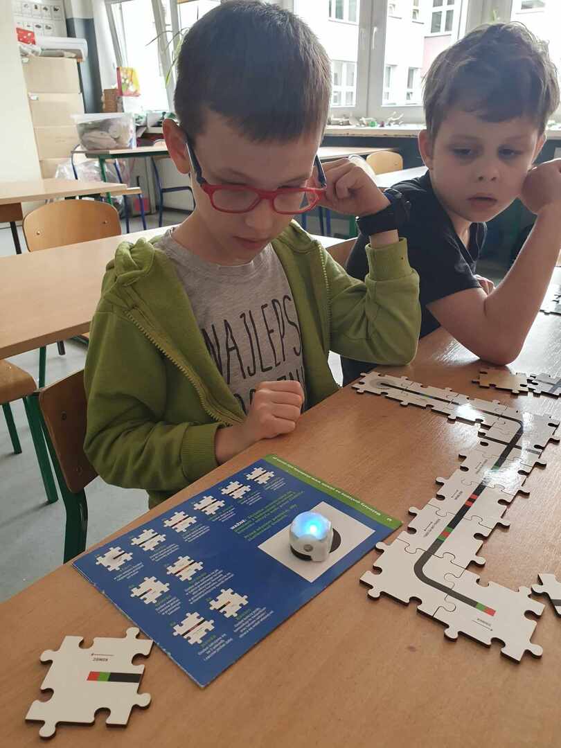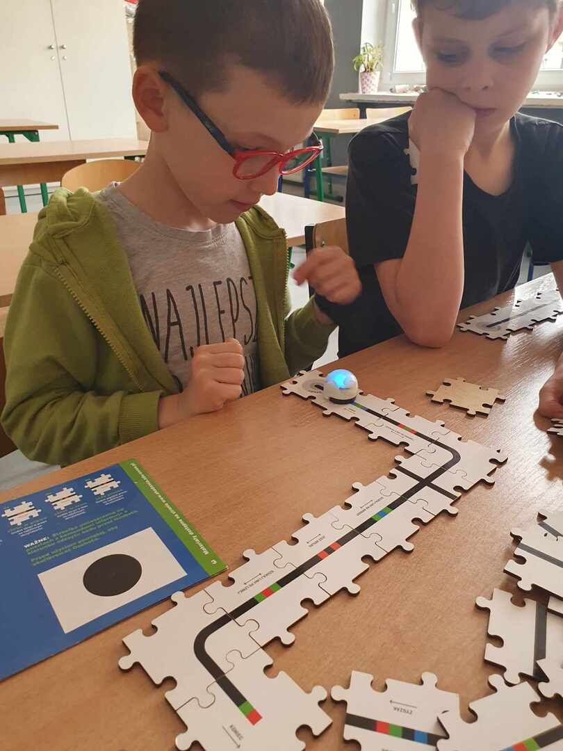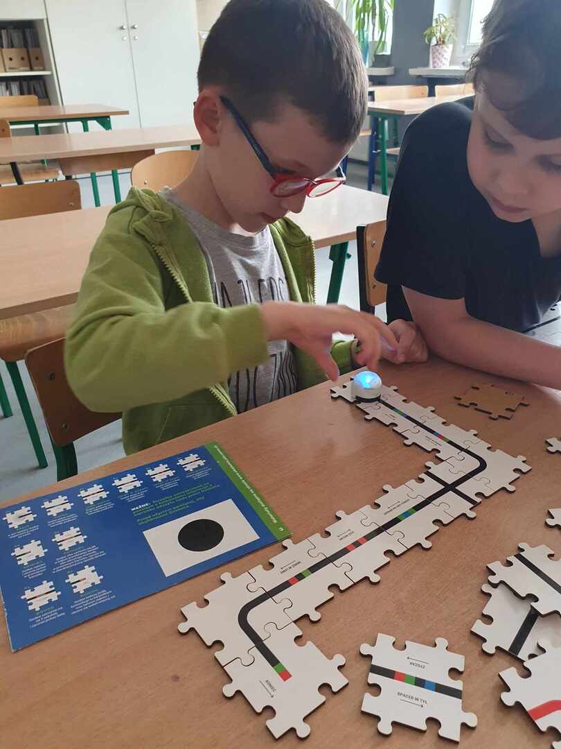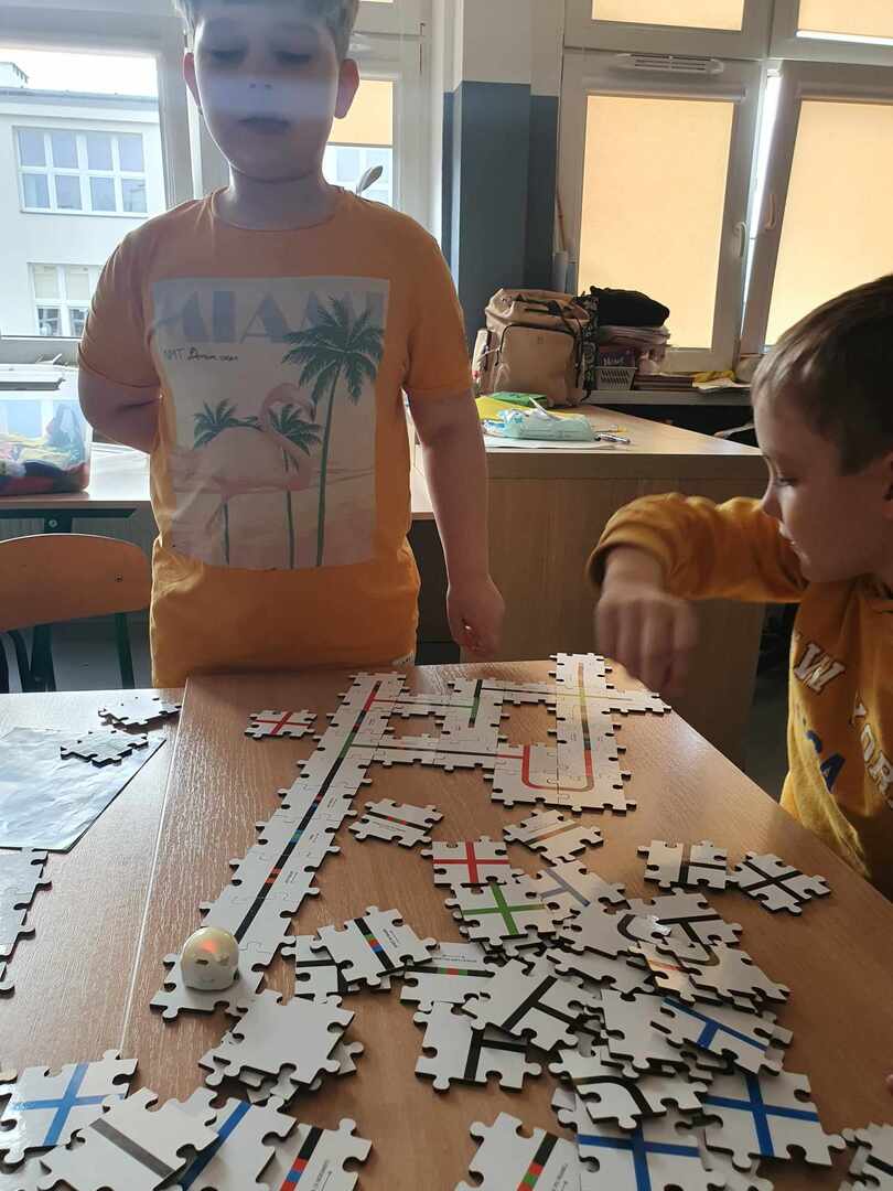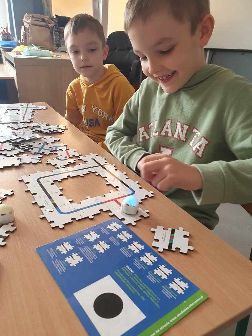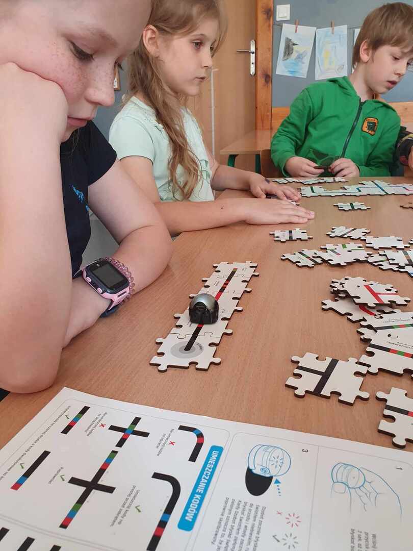 Uczniowie zapoznali się z grupą kodów odpowiedzialnych za poruszanie się robotów(Ozobotów), następnie układali ścieżki przy pomocy specjalnych puzzli tak, aby Ozobot przejechał od linii startu do mety.