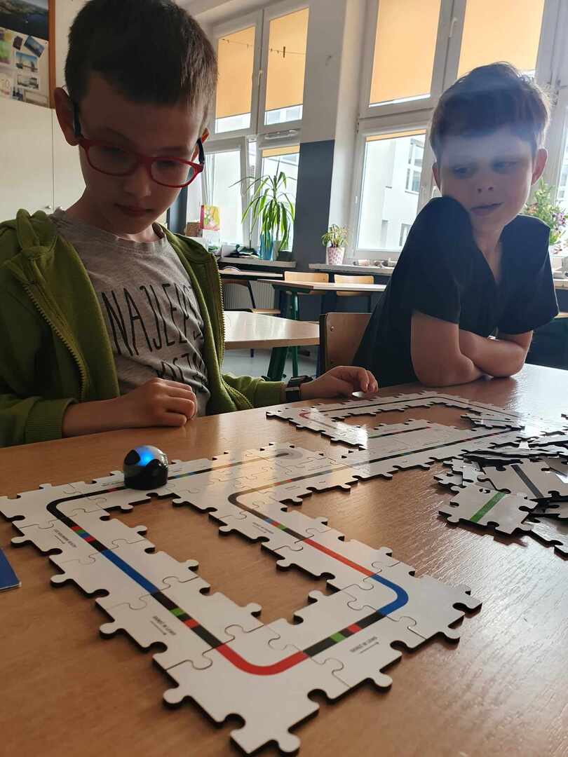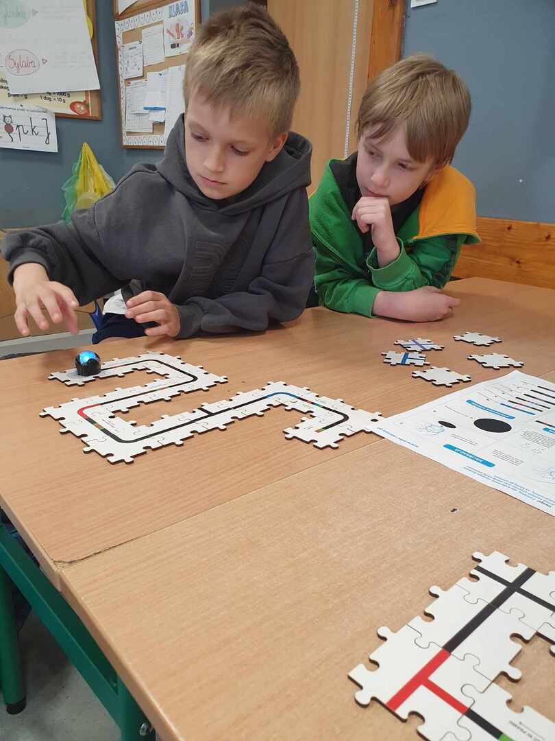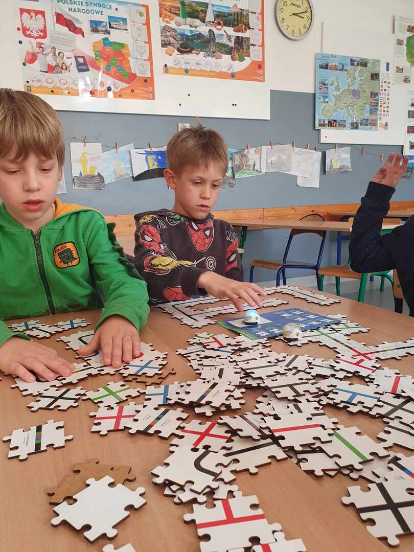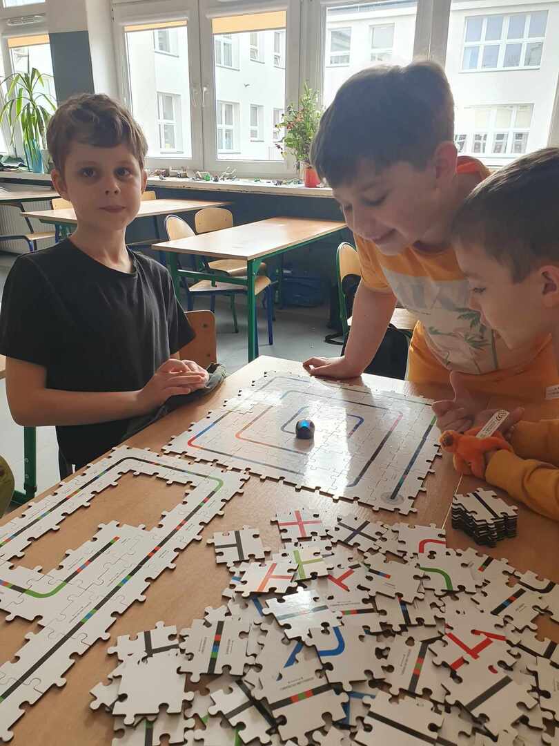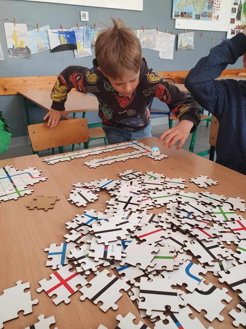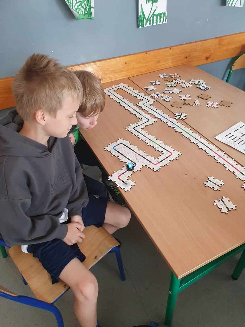 Uczniowie zapoznali się z grupą kodów odpowiedzialnych za poruszanie się robotów(Ozobotów), następnie układali ścieżki przy pomocy specjalnych puzzli tak, aby Ozobot przejechał od linii startu do mety.