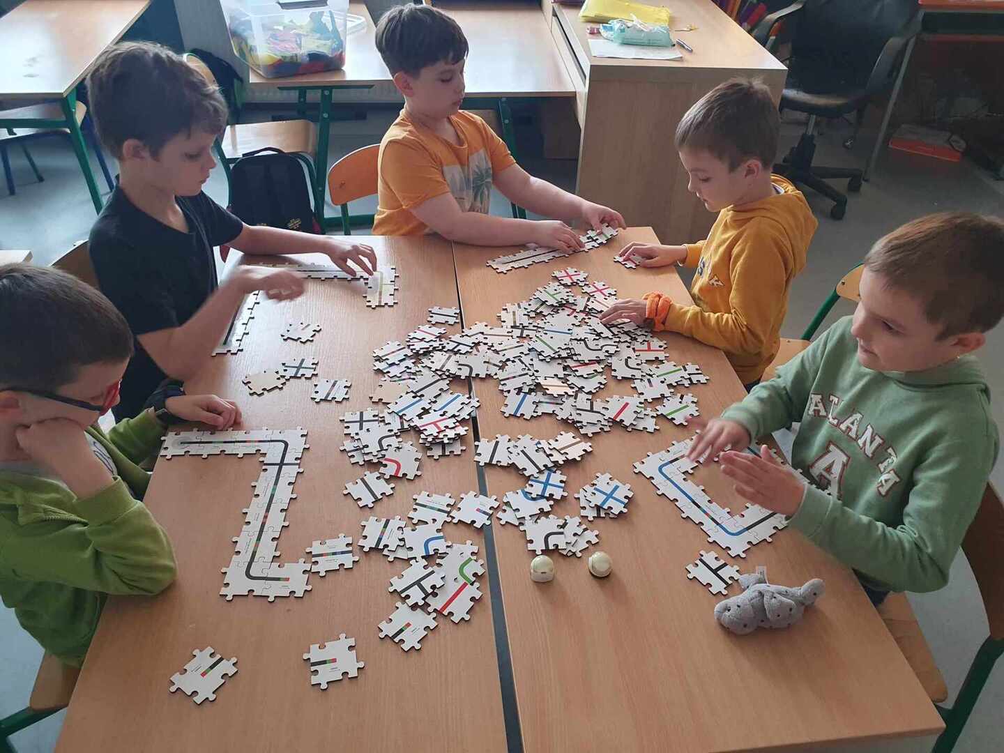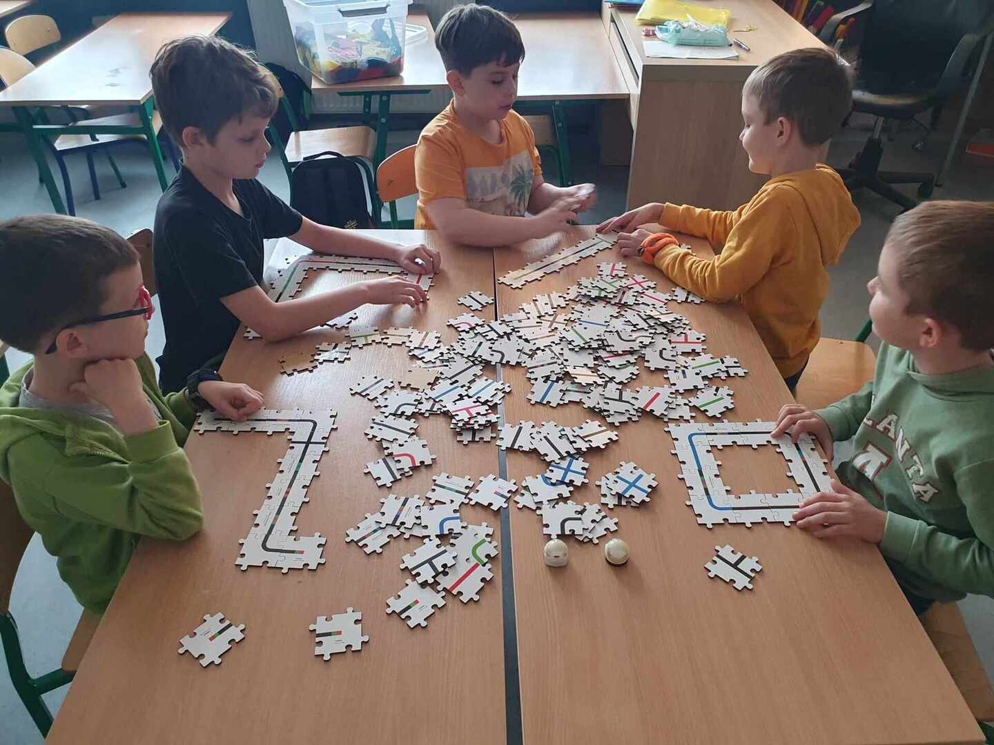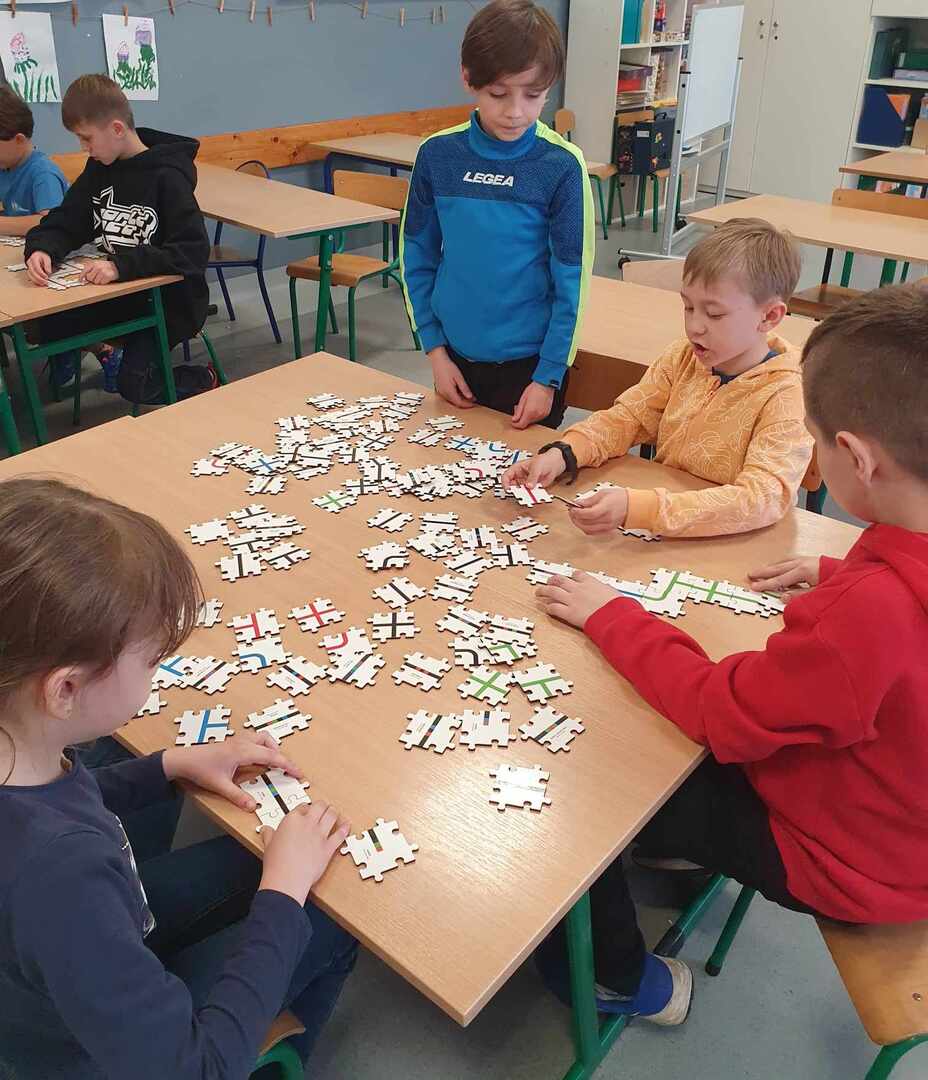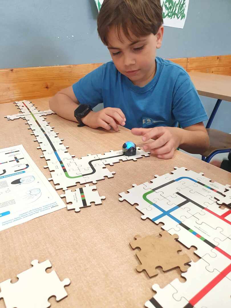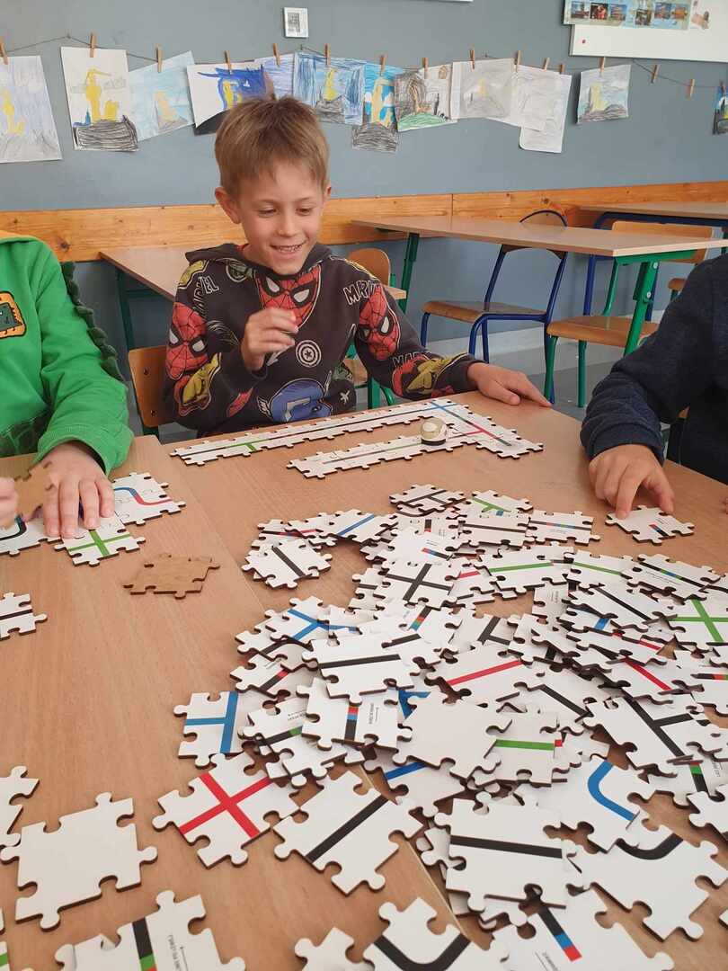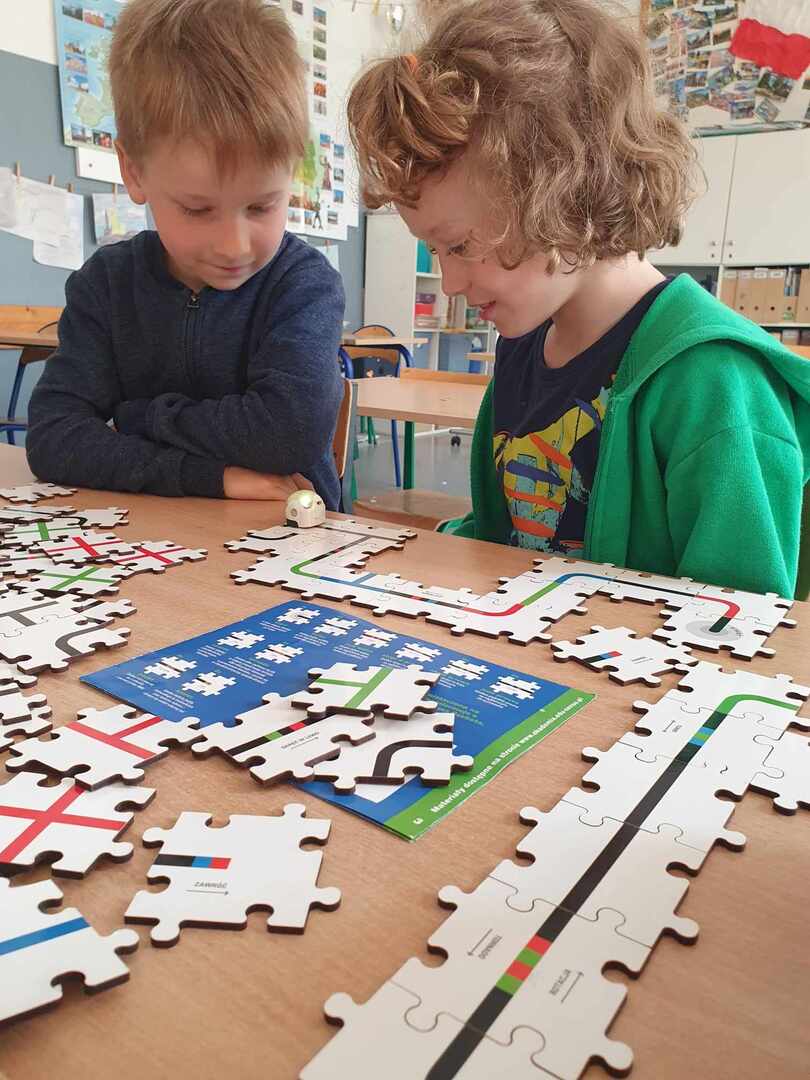 Uczniowie zapoznali się z grupą kodów odpowiedzialnych za poruszanie się robotów(Ozobotów), następnie układali ścieżki przy pomocy specjalnych puzzli tak, aby Ozobot przejechał od linii startu do mety.