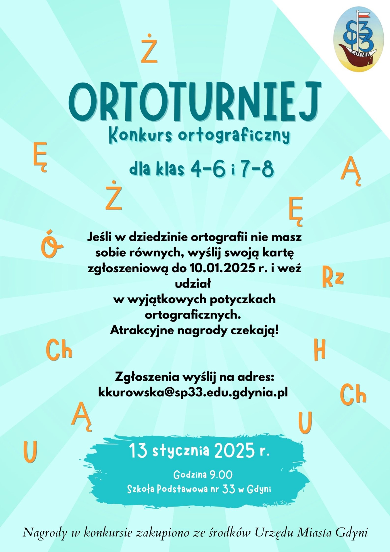 Szkoła Podstawowa nr 33 w Gdyni ogłasza konkurs dla uczniów klas 4-6 i 7-8 gdyńskich szkół podstawowych pod nazwą „Ortoturniej”.