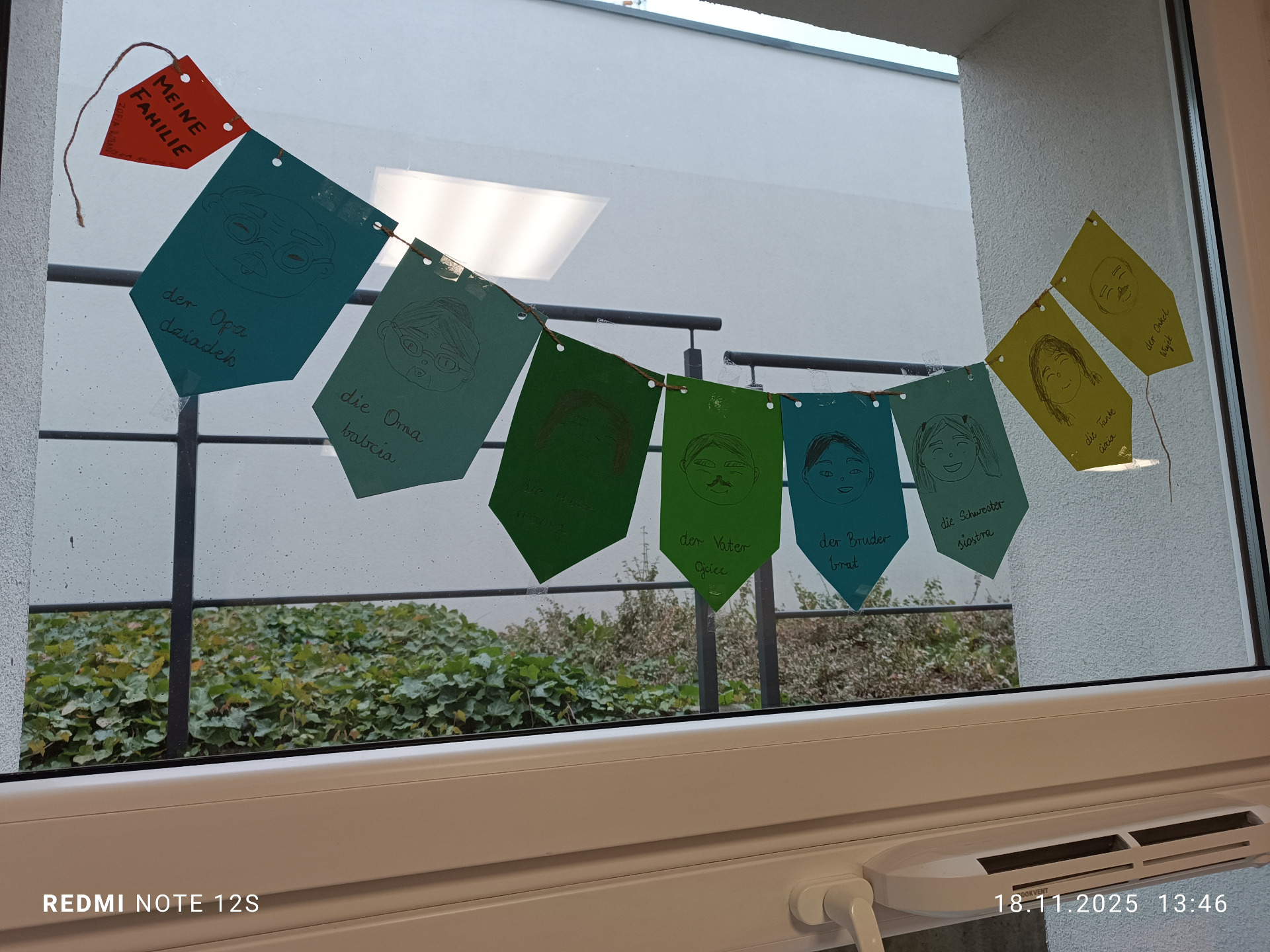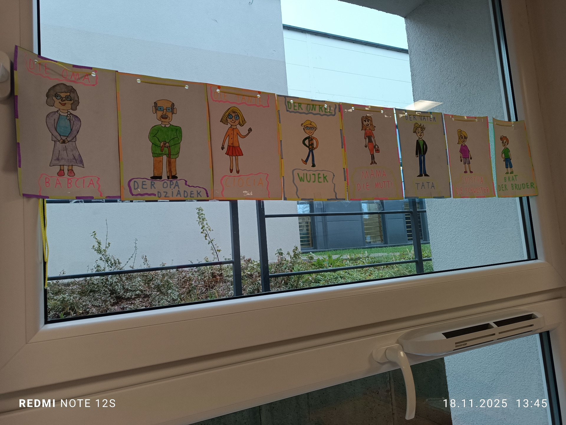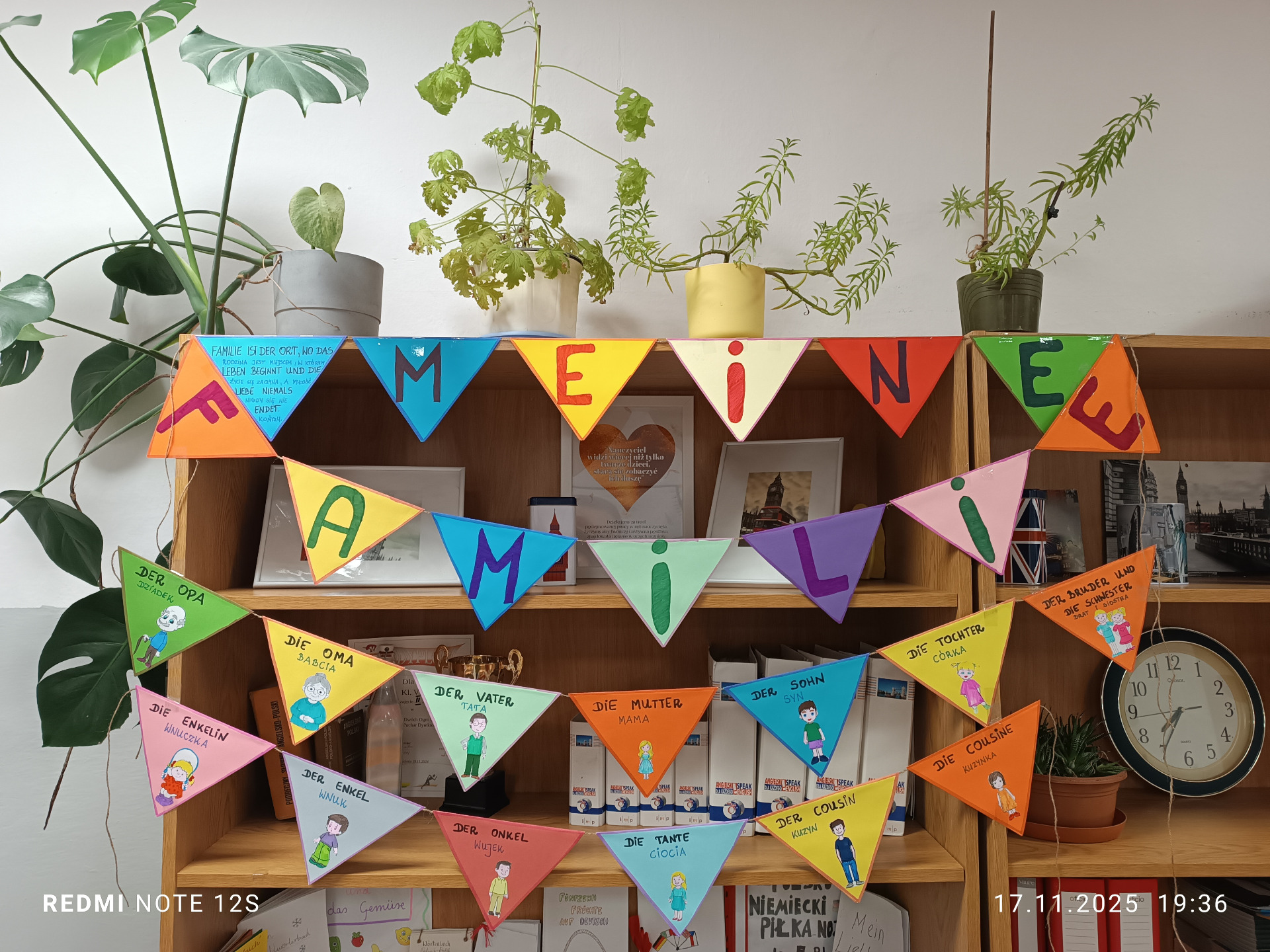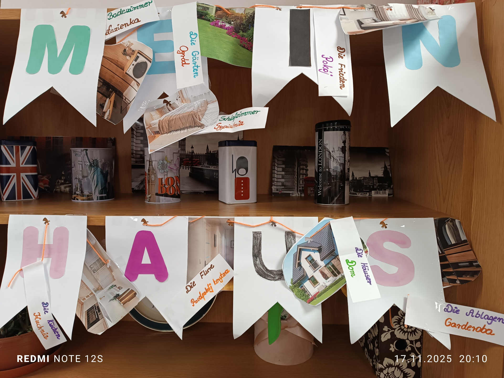 Zadaniem uczniów klas siódmych było wykonanie girlandy na temat: ,,Meine Familie"- ,,Moja rodzina" , natomiast uczniowie klas ósmych zmierzyli się z wykonaniem girlandy o tematyce: ,,Mein Haus"- ,,Mój dom" .