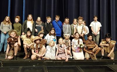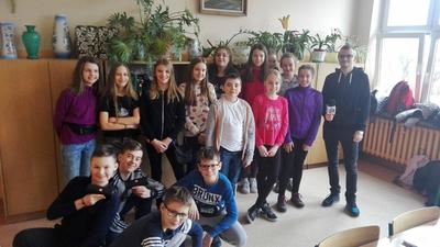 Pamiątkowe zdjęcie uczniów klasy VII b z aktorami spektaklu...